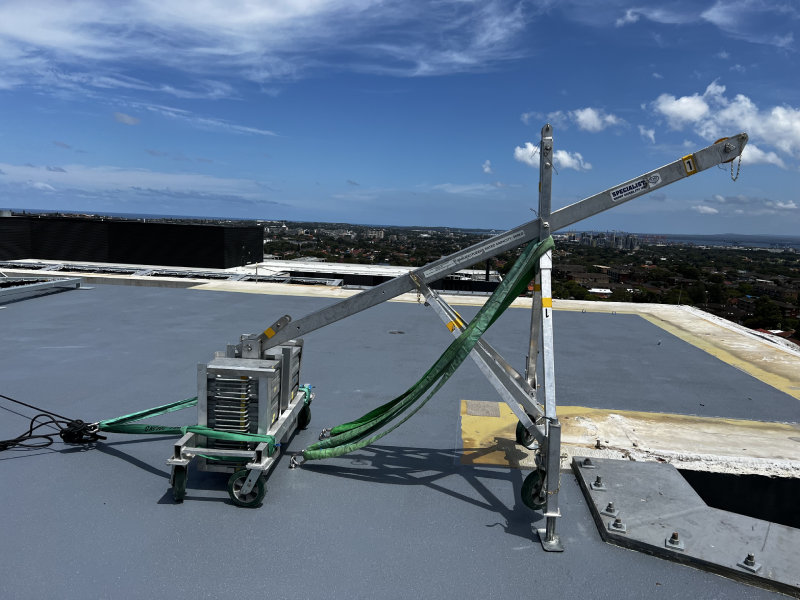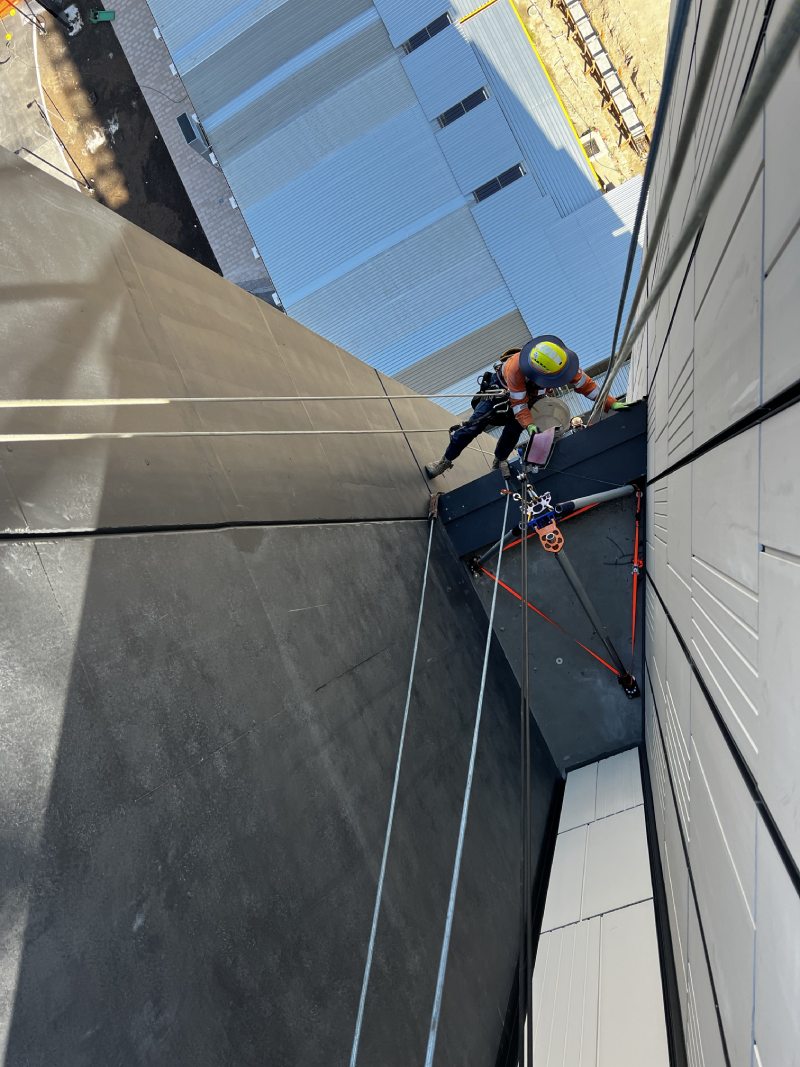 Due to the very small footprint SHA were called into to complete a deglaze 1 of a 180kg vision panel (Level 6/7 Western Elevation) to allow the installation of an Alimac. Accessing via the helipad we used Counterweight rigs tied down via 2 x Ferrule Anchors for back up. A Vortex multipod was set up on the lower roof to create a high point / deviation to avoid a sharp edge for our ropes